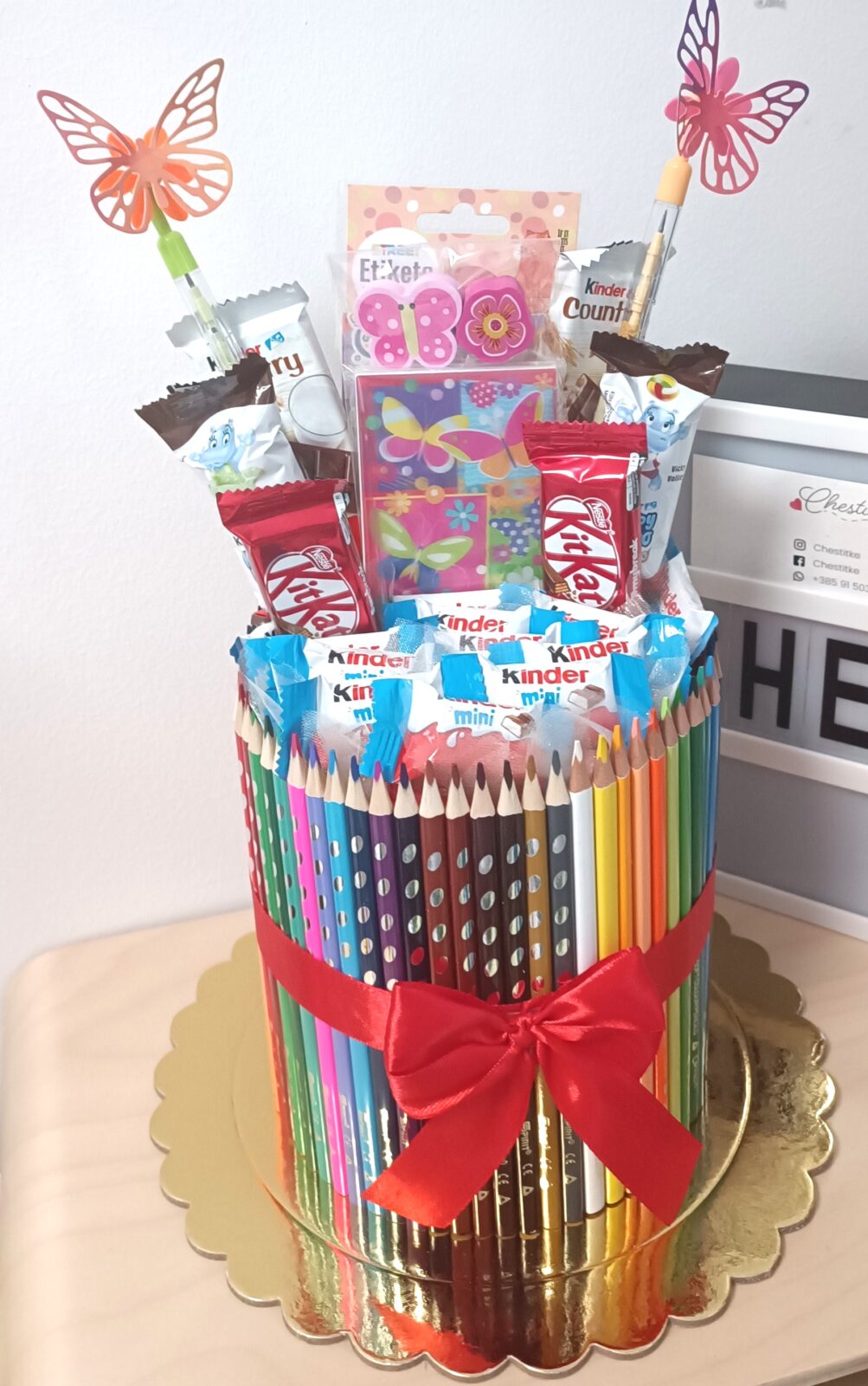 Kreativna torta – sastoji se od Bojica, olovaka i slatkiša . Vesela je dekorativna poslastica savršena za sve kreativce.