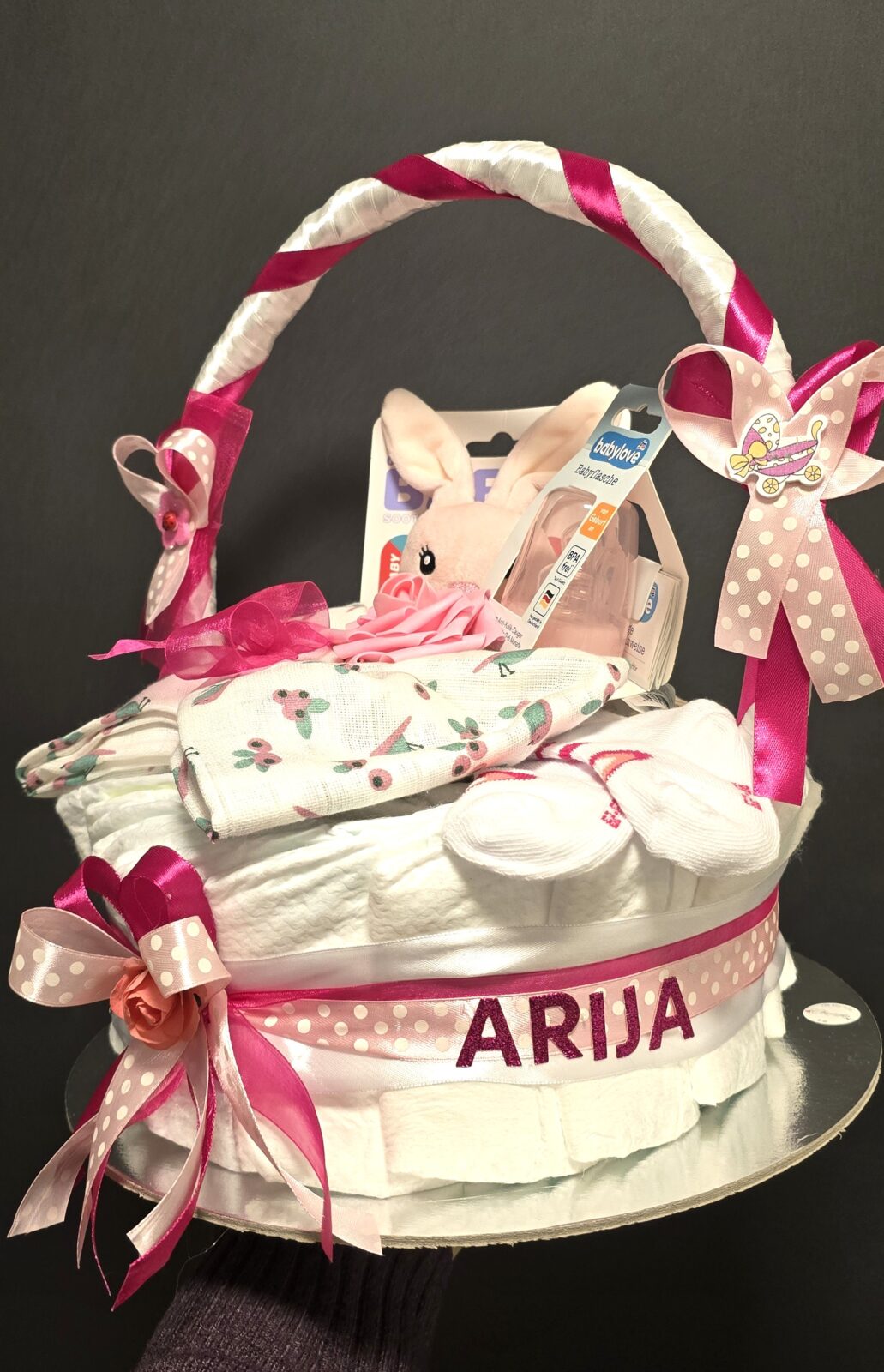 Sastoji se od jednokratnih pelena, personaliziranog lanca za dudu, slinčeka , igračke , bočice i čarapica.